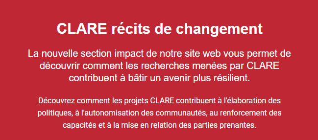 Pour voir comment ces efforts se traduisent déjà en résultats concrets, nous vous invitons à explorer notre page « Impact », où nous avons rassemblé une sélection de récits de changement qui illustrent l’héritage florissant du programme CLARE.
