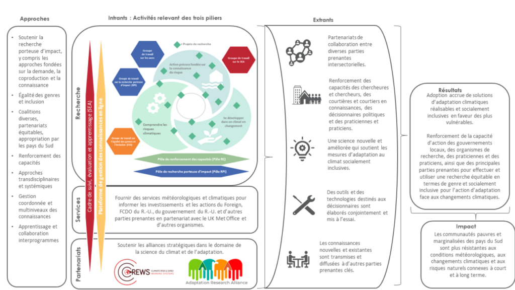 Le programme CLARE vise à produire un impact au moyen d’un portefeuille coordonné de programmes et de projets. Dans son ensemble, il comprend trois piliers qui travaillent collectivement à la réalisation d’extrants, de résultats et d’impacts communs :