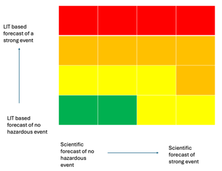 From here, we combine these local forecasts with scientific forecasts into a matrix (see figure below) to establish a consensus forecast. Once the community has agreed to such a consensus forecast, we develop specific impact-based forecasts based on the vulnerable populations identified by the community. Next, we build detailed anticipatory action plans for each group depending on the likelihood of the hazard occurring. Having the community at the heart of the discussion and co-producing the action plans means we can understand exactly what is most useful to the community in advance of a drought. This uncovers pivotal information that a top-down approach could never achieve.
